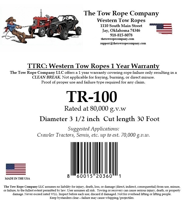 Rope diameter 3 1/2 inch, rated strength 80,000 pounds, cut length 30 foot
