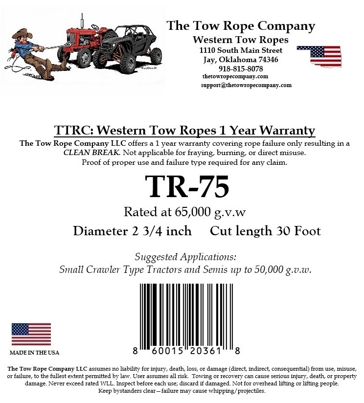 Rope diameter 2 3/4 inch, rated strength 65,000 pounds, cut length 30 foot